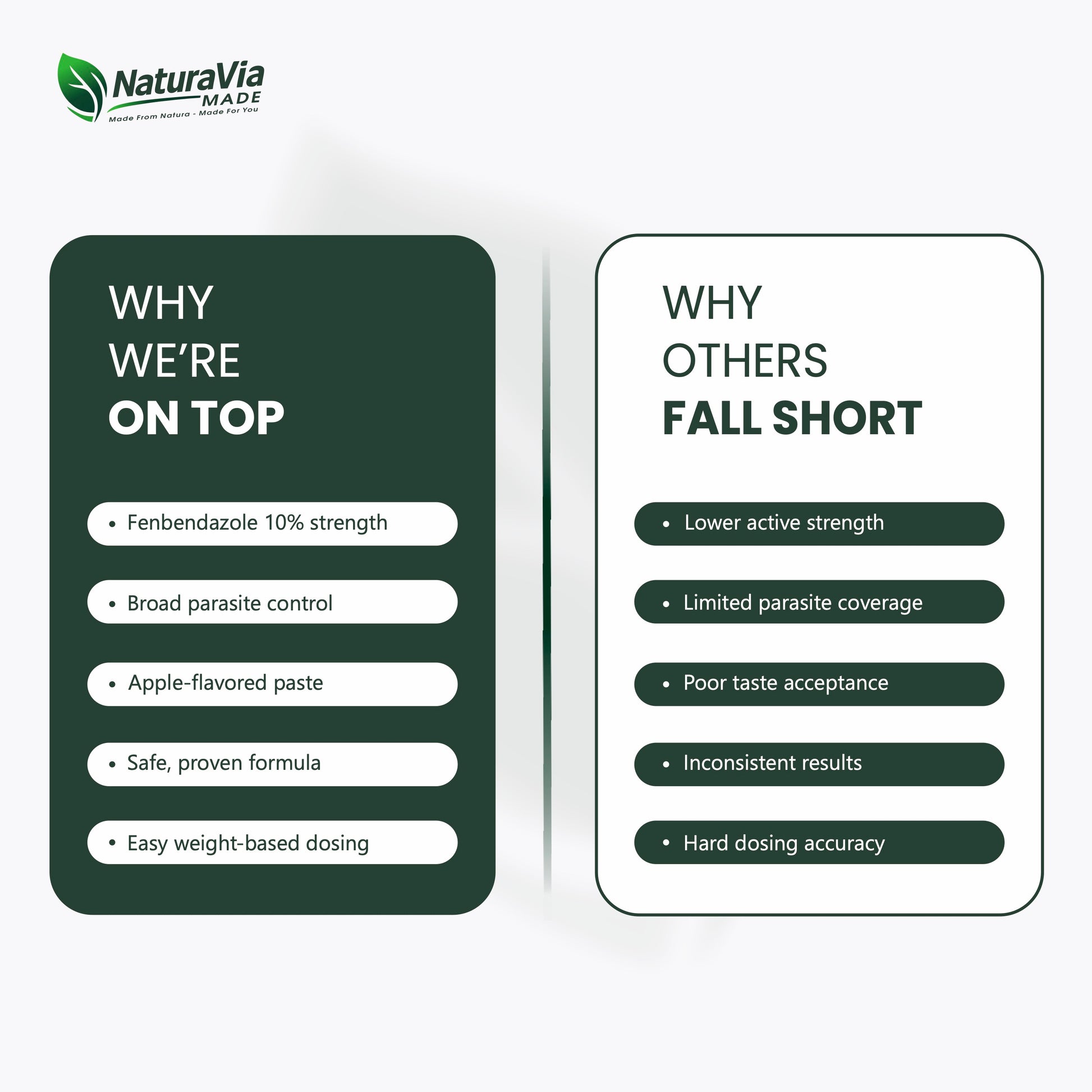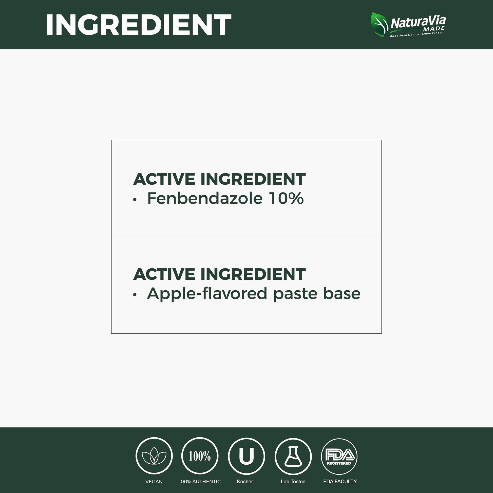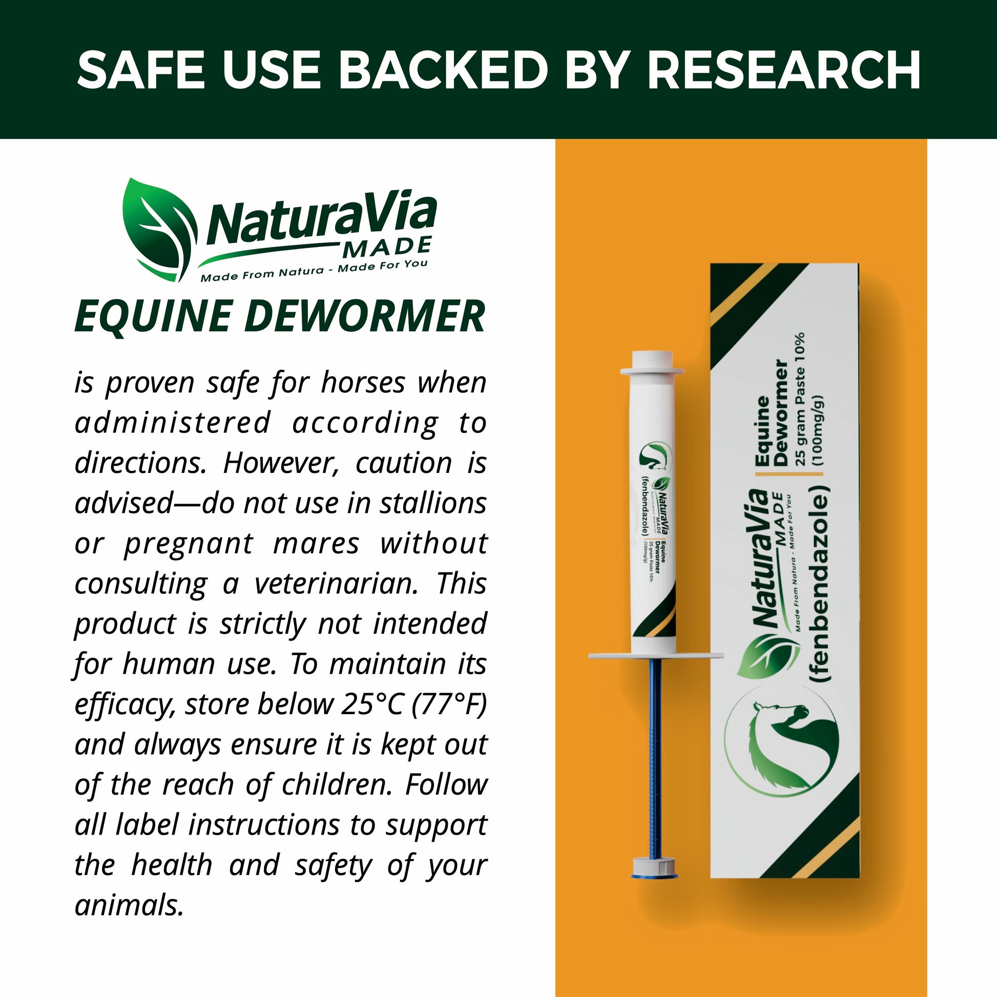NaturaVia Made Fenbendazole Equine Dewormer is a premium, broad-spectrum oral paste formulated for safe and effective parasite control in horses. Each 25g syringe contains 10% fenbendazole (100mg/g)—a veterinarian-trusted ingredient with proven efficacy against large and small strongyles, pinworms, roundworms, and other internal parasites.