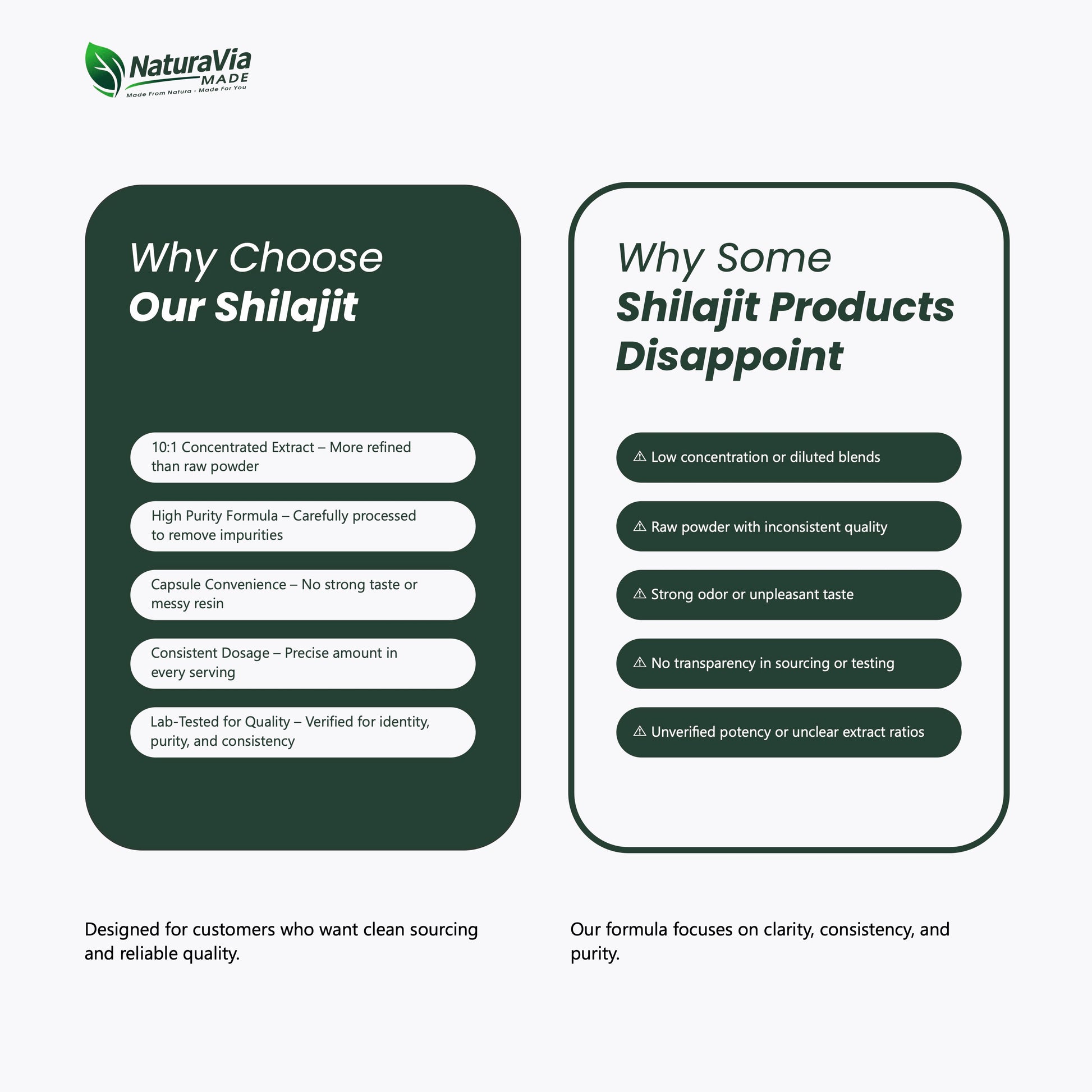 Choose NaturaVia Made Himalayan Shilajit for pure, potent, and safe support — backed by science, tradition, and uncompromising quality.